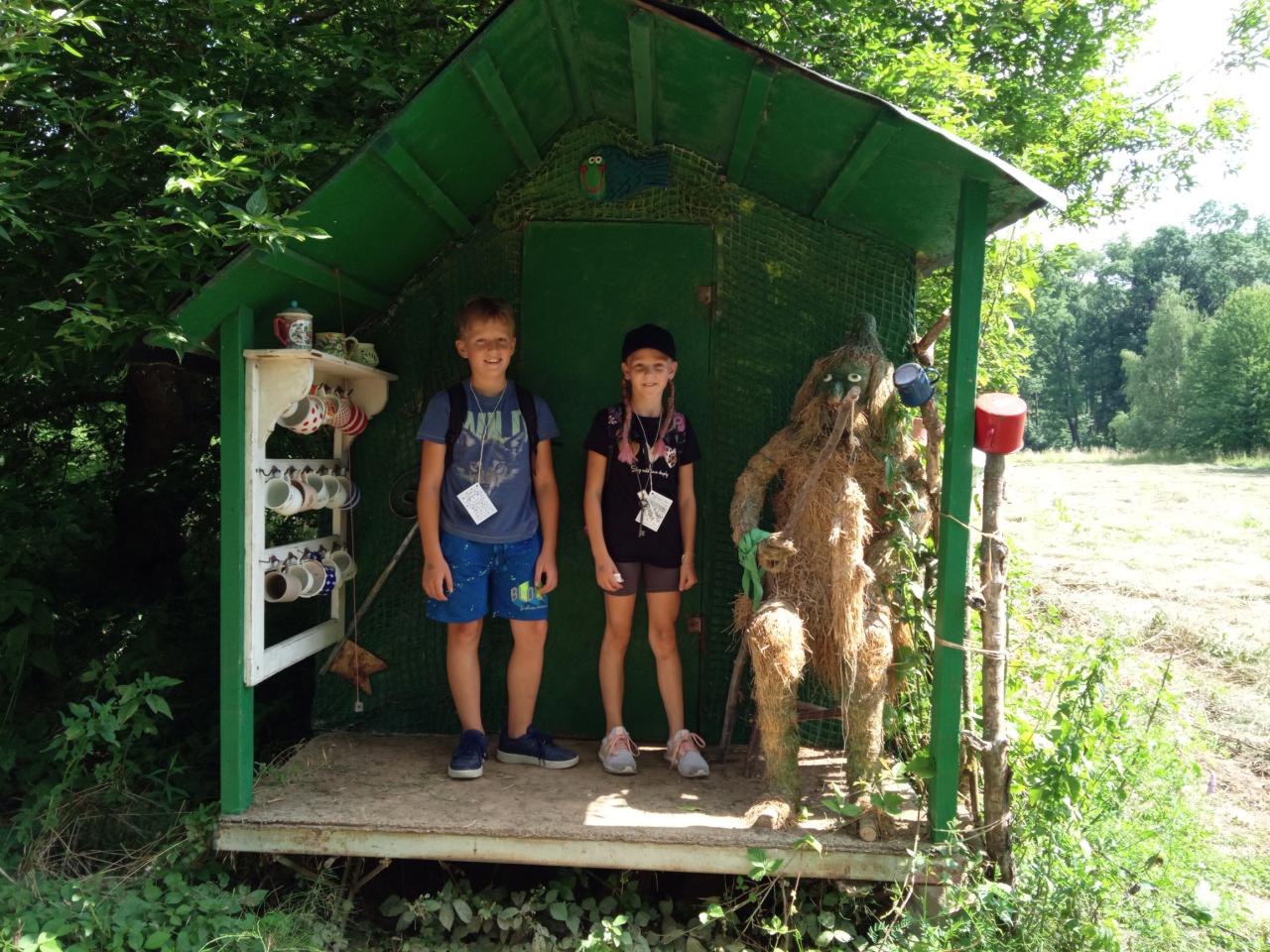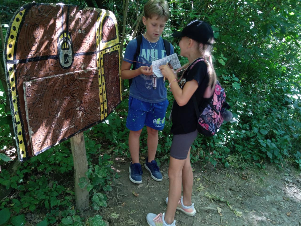 Cesta ubíhala jako voda. Povídali si o zážitcích z domova i dovolené, smáli se, poznávali rostliny a přírodu kolem nás. Netrvalo dlouho a přivítala nás usměvavá paní Šulcová — průvodkyně, která dětem předala notýsek na razítka, herní plán a… klíče od pohádkových chaloupek! Samozřejmě jsme se trochu smáli, že tak malí a už mají každý svůj vlastní dům.
