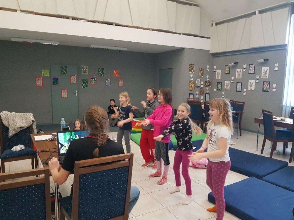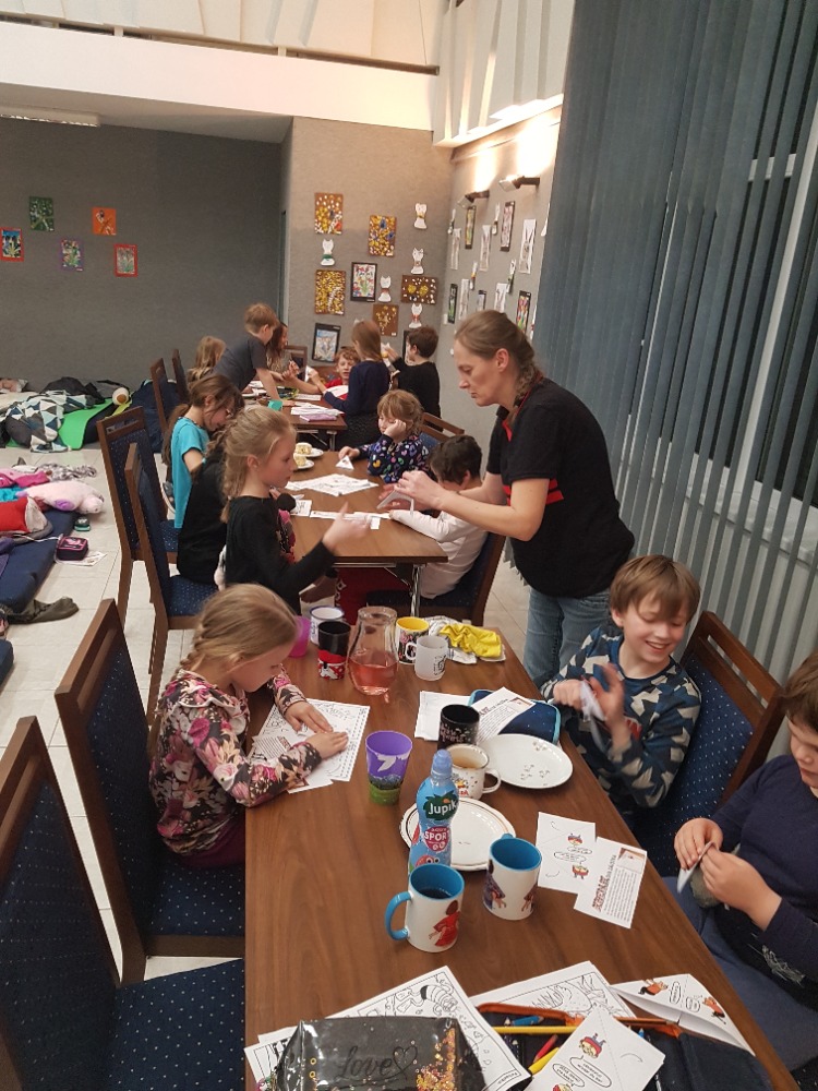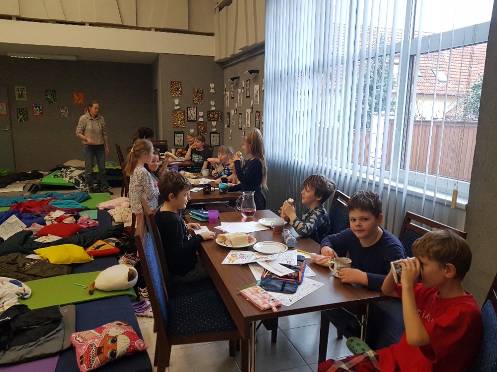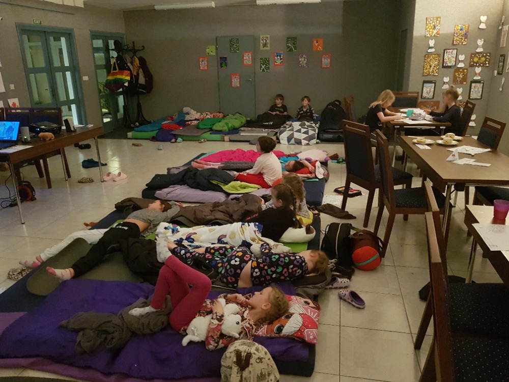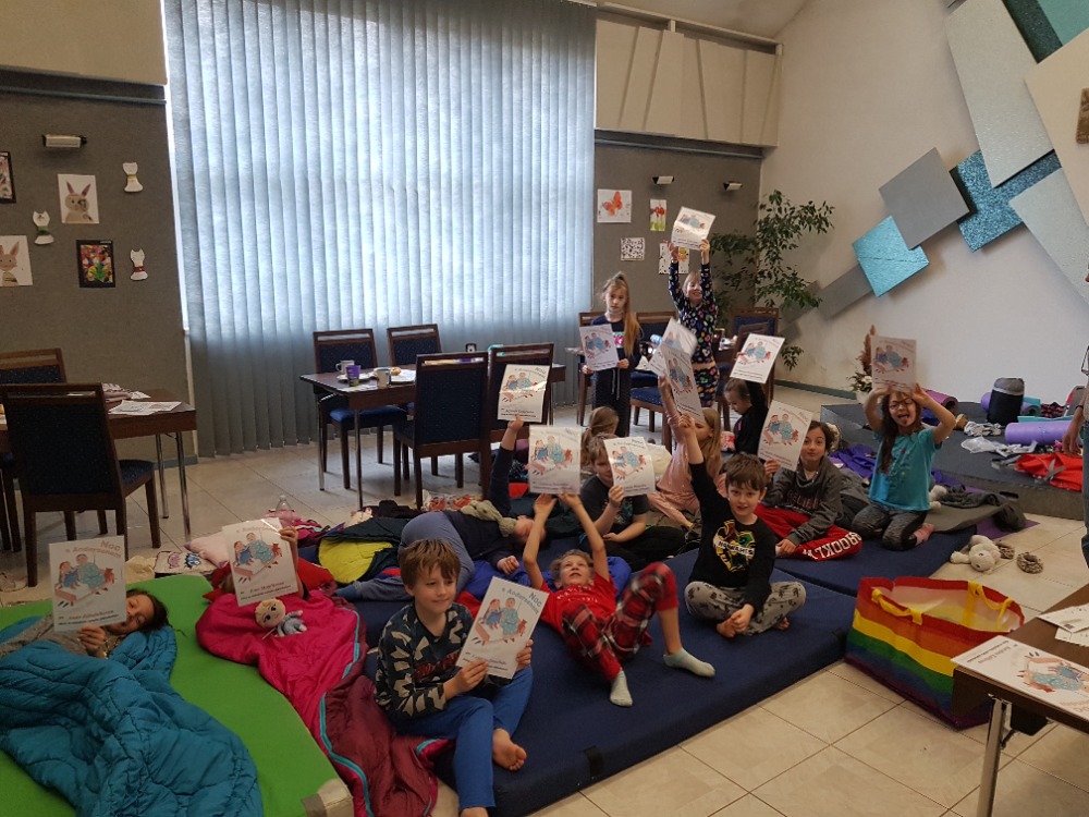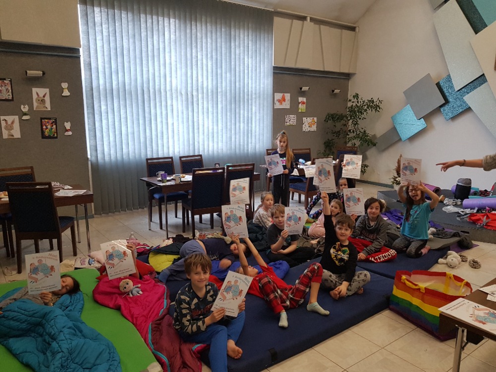 Tato akce byla pro děti doslova pravým „vzrůšem“. Po počátečním se seznamování už šly všechny ostychy mezi nimi stranou a vše se snažily dělat společně. Byl jim slovně představen dánský spisovatel Hans Christian Andersen a posléze postupně promítány jeho čtyři pohádky. Z těchto ukázek následně měly za úkol poznat o jaké pohádky se jedná a napsat jejich název. A aby to nebylo fádní, bylo jim promítnuto krátké video o tom, jak vzniká kniha. Od nápadů spisovatelů až po distribuci do knihkupectví/knihoven. A že těch postupných úkonů bylo. Třeba si i samy vyráběly rožní záložky. Děti si stále měly co povídat, s čím hrát, nebo co jíst (své i nabízené jídlo či darované ostatními rodiči). Po večerní hygieně už se postupně sunuly do spacáků, chvilku ještě štěbetaly, pak po 22. hodině striktně padla večerka a do 15 min. všichni spaly jak dudci. Po probuzení byl v 6:30 budíček (ano - tak brzy (!), protože 1. jsme toho potřebovaly ještě mnoho dalšího stihnout než se rozloučíme s prvními odcházejícími účastníky a za 2. děti samy rády nedočkavostí vstávaly.) Po snídani jim byly rozdány pamětní listy i pohlednice, které si navzájem všichni na památku podepisovaly a samy si dopsaly svou adresu (většinou ji psaly poprvé a tak se naučily i něco navíc. Na ještě lepší probuzení jim byly puštěny dětské písničky (policejní, hasičské, popelářské,...) při nichž si i protáhly své tělíčka. Ve volných chvílích si děti kreslily, splétaly barevné gumičky, hrály si deskové hry (své i zapůjčené z družiny). A pak už nastalo loučení s každým účastníkem, pro kterého si přišel postupně někdo z rodičů. Úsměvný byl jejich dotaz, zda bychom něco takového nemohli pořádat tak 2x do týdne. Co na to říci? Popřemýšlíme nad tím. :-D