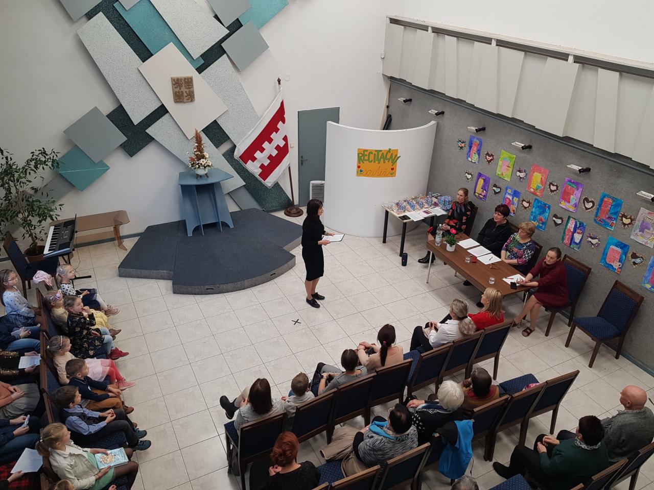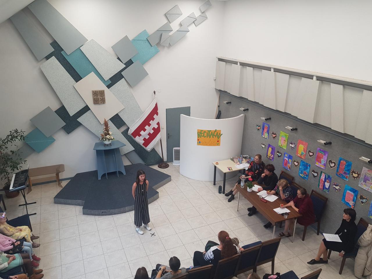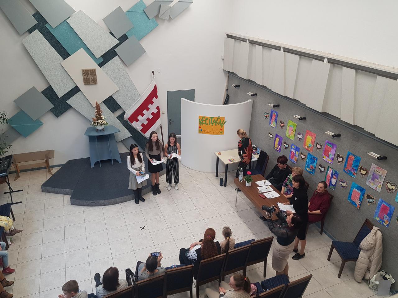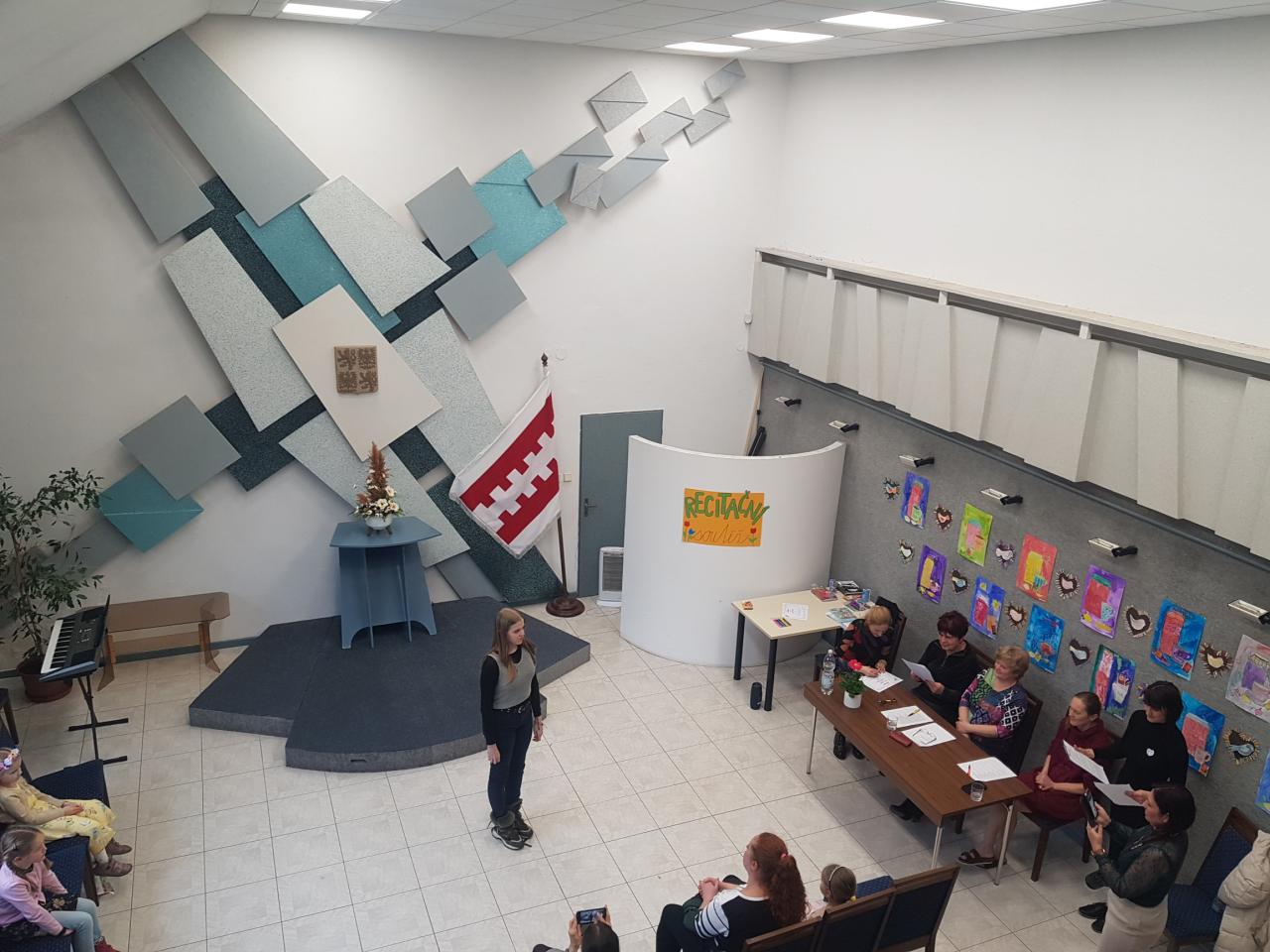 Zaplnili celou obřadní síň a kde zbylo místo zaplnili rodiče i prarodiče. Děti přednášely nejen velice hezky, ale vybíraly si i ze zajímavých témat. A ač porota hledala chyby seč mohla (v hlasitosti, celkově v intonačním přednesu, v kontaktu s obecenstvem i porotou, v mimice, ve výběru úměrně věku přednášejícího, apod.), měla to opravdu těžké. Všechny děti byly výborné. Jen někteří z nich ještě "o fous" lepší a podařilo se jim díky dnešním výkonem postoupit do dalšího kola. Všichni jim už teď přejeme štěstí. Bylo vidět, že rok od roku v soutěži se zdvihá laťka výš a výš. Na žácích je vidět, že je to baví a svou radost/zájem přenesli i na posluchače. I hudební vložka, kterou vyplnili děti z 3. tříd, byla neopominutelná. S úsměvem na rtech odcházely jak soutěžící, učitelky, zpěváci, porota, diváci a už nyní se těšíme na příští ročník.
