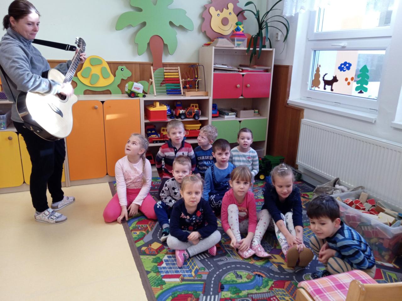 Páteční ráno (16.2.) čekalo děti ze třídy zajíčků překvapení. Že se něco chystá, to věděli. Ale co? Bylo to společné čtení z knížky Medvědi, medvědi, copak nám povědí? od autorky Katjy Reiderové. V knize, kde jsou zakomponované pěkné tematické obrázky v textu, se všichni zorientovali rychle. Společně jsme louskli všechny 4 kapitoly o medvídkovi Jošovi a jeho dobrodružstvích. A aby toho nebylo málo, tak děti za doprovodu tónů linoucí se z kytary (na kterou hrála paní učitelka Chabičová), krásně zpívaly, recitovaly, cvičily, ... prostě jsme se všichni dobře bavili. Bylo to pěkné, milé, veselé a proto se již nyní těšíme, až se zase někdy společně sejdeme a něco "probereme".